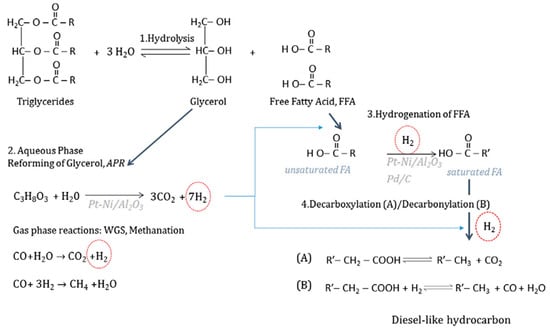 Triglyceride conversion pathways in the presence of hydrogen. Reproduced with permission, Ref. [27].