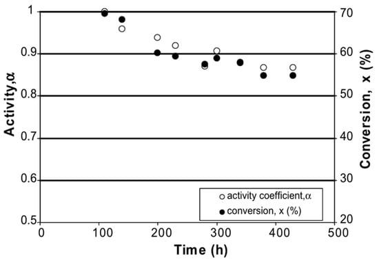 Figure 6 illustrates the activity of the catalyst and the conversion of ester over time. The catalyst underwent stabilisation during the initial 100 h, after which its activity was monitored as an activity coefficient value set as the reference one (∝ = 1). As depicted in Figure 6, the catalyst’s activity gradually decreases up to 300 h of operation, experiencing a reduction of approximately 13% compared to the reference value. Subsequently, it proves that the performance of the catalyst was rather stable to reach a steady state beyond this period.