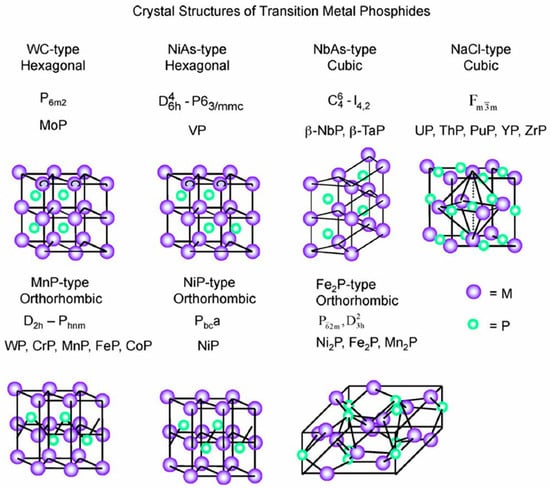 Transition metal phosphides (TMP) represent a fascinating category of materials warranting exploration at the nanoscale due to their diverse range of properties and potential applications. When employed as catalysts, phosphides rich in metal exhibit outstanding activity in hydrogenation reactions. Several reviews have detailed the nature, structure, and synthesis of phosphides [108,109,110,111,112,113].
