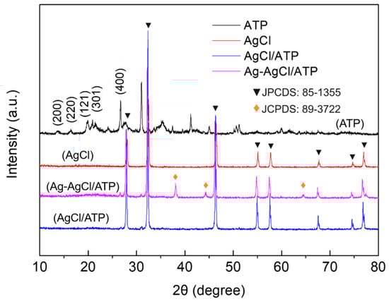 To determine the crystal structure and composition of the synthesized photocatalytic material, Figure 1 presents the X-ray diffraction (XRD) spectra of ATP, silver chloride (AgCl), AgCl/ATP, and Ag-AgCl/ATP composites. The XRD pattern of attapulgite displays prominent peaks at 2θ values of 13.7°, 16.08°, 20.67°, 21.24°, and 27.5°, corresponding respectively to the (200), (220), (301), (121), and (400) crystallographic planes of ATP [,]. Notably, the AgCl peaks appear at 2θ = 27.7°, 32.4°, 46.2°, 54.8°, 57.7°, 67.6°, 74.5°, and 76.9°, aligning with the (111), (200), (220), (311), (222), (400), (331), and (420) planes of AgCl (JCPDS:85-1355) [,]. Furthermore, peaks at 38.1° and 44.3° confirm the presence of metallic silver (Ag) corresponding to the (111) and (200) planes (JCPDS: 89-3722), indicative of an in-situ reduction of Ag+ ions on the AgCl surface []. This reduction process facilitates the conversion of Ag+ to metallic Ag, confirming the successful preparation of the Ag-AgCl/ATP composite photocatalyst.