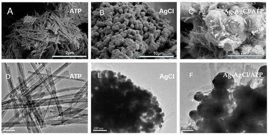 SEM of attapulgite (A), AgCl (B), Ag-AgCl/ATP (C), TEM images of attapulgite (D), AgCl (E), Ag-AgCl/ATP (F).
