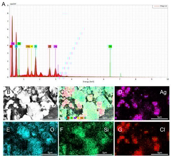 Elemental mapping results of 75%-Ag-AgCl/ATP (A–G), Ag (D), O (E), Si (F), Cl (G).