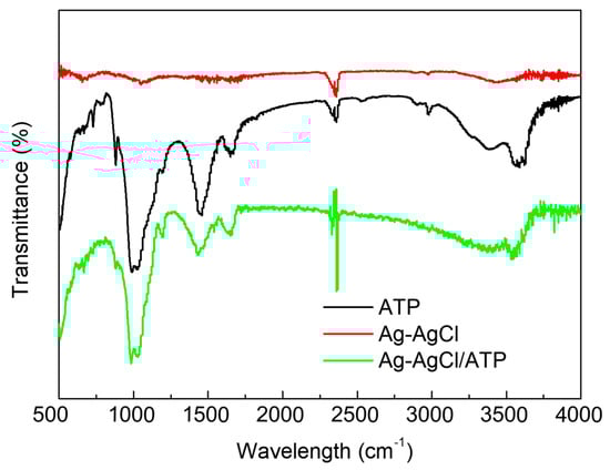 Figure 4 shows the FT-IR spectra of ATP, Ag-AgCl, and Ag-AgCl/ATP. ATP primarily consists of palygorskite, characterized by prominent infrared spectral peaks at 510, 980, 1030, 1460, 1640–1660 and 3450–3600 cm−1. In the mid-wave number region, the peaks at 980 cm−1 and 1030 cm−1 correspond to the stretching vibrations of Si–O–Si bonds within the internal structure of ATP [,,]. The peaks observed at 1460 and 1640 cm−1 are attributed to coordinated water (surface-adsorbed water) and zeolite water (pore channel). In the high-wave number region, the peak at 3540 cm−1 reflects the stretching vibration of coordinated water, while the peak at 3600 cm−1 corresponds to bond stretching in ATP. The FT-IR spectra of Ag-AgCl/ATP composites indicate that the fundamental properties of attapulgite remain unchanged throughout the synthesis process.