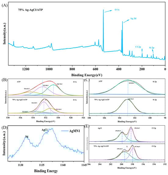 (A) XPS spectra of survey scan of 75% Ag-AgCl/ATP; High-resolution XPS spectra of (B) O 1s, (C) Si 2p, (D) AgMN1, (E) Cl 2p.
