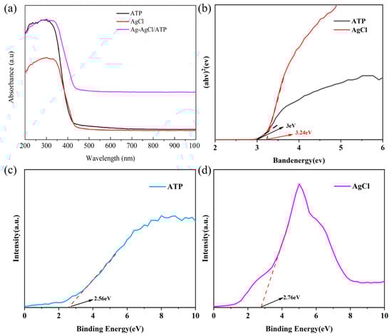 DRS pattern of Ag-AgCl/ATP, ATP and AgCl (a). Band gap spectra of as-prepared samples (b); VB-XPS of ATP (c) and AgCl (d).