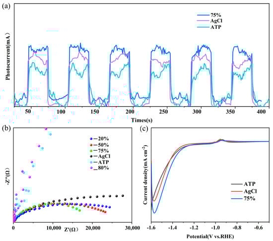 To further investigate charge transfer and separation effects, electrochemical tests were conducted. Figure 7a illustrates stable photocurrent density profiles across all samples, with composites exhibiting prominent photocurrent signals compared to bare ATP with AgCl; notably, the 75% loaded sample shows optimal photocurrent intensity. This suggests that AgCl addition effectively enhances hole-electron pair separation []. Furthermore, impedance spectra (EIS) of composite samples with varying AgCl proportions alongside pure AgCl and ATP are presented in Figure 7b. Results reveal the smallest arc radius for the 75% Ag-AgCl/ATP electrode, indicating lower interfacial resistance conducive to enhanced electron transport []. Linear sweep voltammetry (LSV) curves in Figure 7c demonstrate that 75% Ag-AgCl/ATP exhibits the lowest overpotential at identical current densities, underscoring the catalysts’ synergistic facilitation of photocatalytic degradation processes. In Figure 6b, the band gaps of ATP and AgCl were tested and found to be 3 eV and 3.24 eV, respectively, and the valence bands (VB) of ATP and AgCl were measured in Figure 6c,d using XPS valence band spectroscopy to be 2.56 eV and 2.76 eV, respectively, and through the empirical formula EVB = ECB + Eg, it can be obtained that the conduction bands (CB) for ATP and AgCl were −0.44 eV and −0.48 eV.