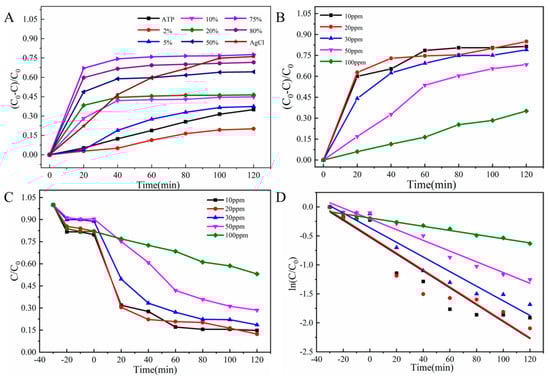 (A) Different loading amounts of Ag-AgCl/ATP; (B) optimal Ag-AgCl/ATP degradation of different concentrations of TC; (C) degradation efficiency of different concentrations of TC; (D) quasi-first kinetic curve, the trend of ln(C0/C) with time under different starting concentrations.