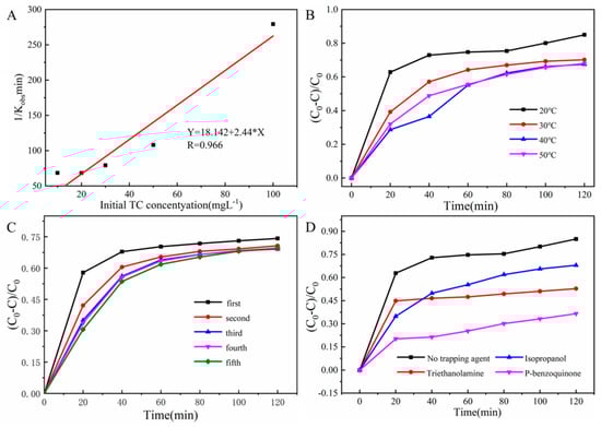 It can be seen from Formula (4) that the reciprocal rate (1/kobs) and the initial concentration of TC show a linear relationship. At the same time, the photocatalytic degradation rate of TC, kobs, changes with the initial concentration, as shown in Figure 9A. According to the slope and intercept of the straight line, the equilibrium adsorption constant of TC KTC = 0.135 L mg−1, and the pseudo-second rate constant kc = 0.933 mg L−1 min−1. In Table 1, we also show the effects of different concentrations on the degradation rate.
