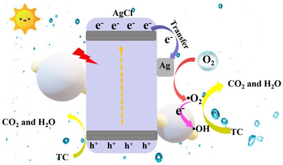 The role of active species in the photodegradation of TC using an Ag-AgCl/ATP composite photocatalyst was elucidated through a series of trapping experiments. Figure 9D illustrates that the addition of isopropanol, a scavenger for ·OH, has a minimal effect on the degradation rate of TC, indicating a marginal role of ·OH radicals in the degradation process. Conversely, the addition of triethanolamine, a scavenger for h+, significantly impacts the TC degradation rate more than isopropanol, suggesting a predominant role of h+ over ·OH radicals in the TC degradation mechanism. However, the overall influence of both species is limited, leading to the introduction of p-benzoquinone to further probe the degradation kinetics. In Figure 10, the mechanistic pattern of the reaction can be seen. This addition markedly reduces the photocatalytic degradation efficiency of TC compared to the baseline condition without scavengers, confirming that the·O2− is the principal active species in the degradation process. Experimental findings reveal that: (1) the inherent high specific surface area of attapulgite provides numerous active adsorption sites, enhancing the photocatalytic activity of the Ag-AgCl/ATP composite; (2) the presence of silver on the AgCl surface induces plasmon resonance effects upon photolysis, facilitating the generation of active species such as h+ and ·O2−, which substantially improve the photocatalytic efficiency of the composite material.