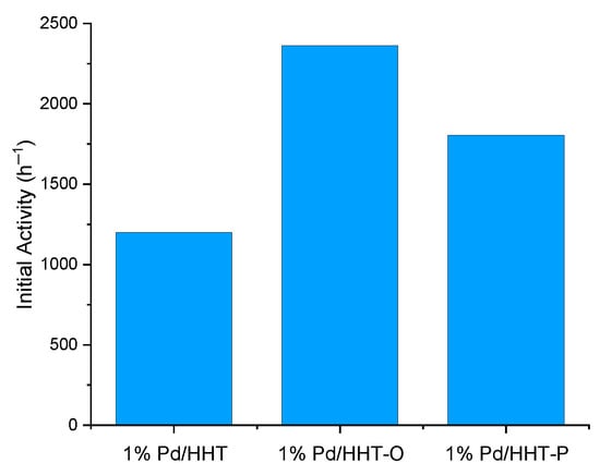 The three catalysts were tested at the same conditions in catalytic direct hydrogenation of muconic acid: reactions were carried out at 70 °C, at 3 bar absolutes of hydrogen with a catalysts/substrate molar ratio of 1/500. To have a first understanding of their behaviour the initial activity, the conversion of muconic acid and the yield of adipic acid were evaluated using Equation (5), Equation (3) and Equation (4), respectively. As it possible to observe in Figure 2, all the catalysts have a good initial activity, comparable with those obtained in other previous study [32], but the functionalized ones show better results, namely 2362.5 h−1 and 1805.5 h−1 for 1% Pd/HHT-O and 1% Pd/HHT-P respectively, compared to 1200.0 h−1 for 1% Pd/HHT. Among all, the Pd/HHT-O shows the highest initial activity, 97% higher than Pd/HHT and 31% than Pd/HHT-P; while Pd/HHT-P has an initial activity 50% higher than Pd/HHT. Also in the case of FAD [31], the oxygenated catalyst had shown the highest value of initial activity in respect to the others.