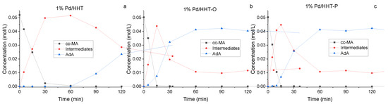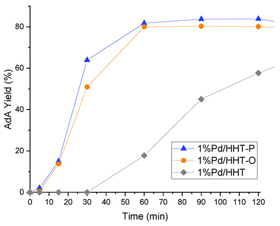 As a proof of this, it is possible to observe how in the case of the non-functionalized HHT catalyst (Pd/HHT), where the complete conversion of muconic acid was reached after 60 min, there isn’t formation of adipic acid before the first hour of reaction. While in the case of Pd/HHT-O and Pd/HHT-P, there is already production of adipic acid after 15 min of reaction (Figure 3 and Figure 4).