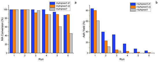 As expected, Pd/HHT underwent degradation from the third run onwards (Figure 5). Differently, the functionalized catalysts maintained a MA conversion above 90% for up to six consecutive reactions and in particular in the case of 100% till the fourth recycle (Figure 5a). Even in the case of adipic acid production, only the two functionalized catalysts continued to produce AdA up to the sixth run (Figure 5b).