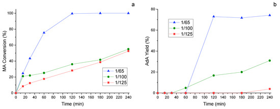 Study of the influence of the metal/substrate ratio: 1/65, 1/100 and 1/125 in the catalytic transfer hydrogenation: (a) MA conversion and (b) AdA Yield monitored along time. Reaction conditions: MA concentration 0.005 M, temperature 70 °C, pressure of N2 3 bar, MA/FA ratio 1/10, 1200 rpm.