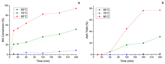 Study of the influence of the temperature. (a) MA conversion and (b) AdA Yield monitored along time. Reaction conditions: MA concentration 0.005 M, metal substrate molar ratio 1/100, pressure of N2 3 bar, MA/FA ratio 1/10, 1200 rpm.