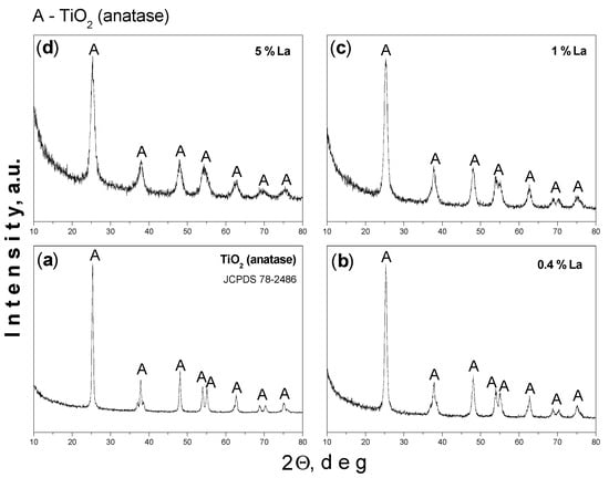 Figure 1 displays the XRD patterns of the pure (a) and La-doped TiO2 samples (b–d). As shown, anatase (TiO2) (JCPDS 78-2486) is a dominating crystalline phase. There were no rutile peaks visible. Furthermore, no lanthanum was found in the patterns, which is due to the bigger radius of La3+ (0.1061 nm) as compared to that of the Ti4+ ion (0.0605 nm). Thus, it is hard for La3+ ions to substitute Ti4+ ions in the TiO2 lattice and it is reasonable to suppose that La3+ ions are located at the surface of TiO2 [,,]. La3+ ions act as charge carrier trapping centers on the surface of TiO2, which suppresses the recombination of photogenerated electron–hole pairs and prolongs the lifetime, thus increasing the photocatalytic activity []. On the other hand, lanthanum modification cannot accelerate the phase transition of anatase into rutile, as already reported [,,]. According to Ding et al. [], as the melting point of La2O3 (2217 °C) is higher than that of TiO2 (1640 °C), La doping retards the anatase–rutile phase transition.