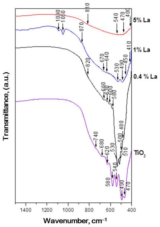 The structural investigations of the heat-treated at 500 °C La-TiO2 powders were investigated by means of IR spectroscopy, and the stretching vibrations of the inorganic building units in the range of 1400–400 cm−1 (Figure 4) have been considered. They have been compared to those of pure TiO2. As seen from the figure, the increase in La content makes the bands unresolved. Looking at the spectra, several absorption ranges could be distinguished: 540–410 cm−1, 670–580 cm−1, and 1090–820 cm−1. It is well known that the wide absorption band between 800 and 400 cm−1 could be related to the Ti–O []. This is confirmed by the IR spectrum of the reference TiO2, where it is seen that the absorption bands are well defined and sharper (Figure 4). This is in agreement with the XRD results that the reference sample has a higher crystallinity than the samples synthesized and calcined in this work. These experimental results coincide well with other studies []. Usually, the characteristic vibrations of La–O are found at 860–850, 670, and 430 cm−1 []. Having in mind the spectra obtained by us, it is difficult to distinguish the characteristic bands of the TiOn and LaOn structural units. The absorption bands of about 1000 cm−1 can be ascribed to the T–O bending, external symmetric stretching, and internal asymmetric stretching vibrations or C–O stretching vibrations [].