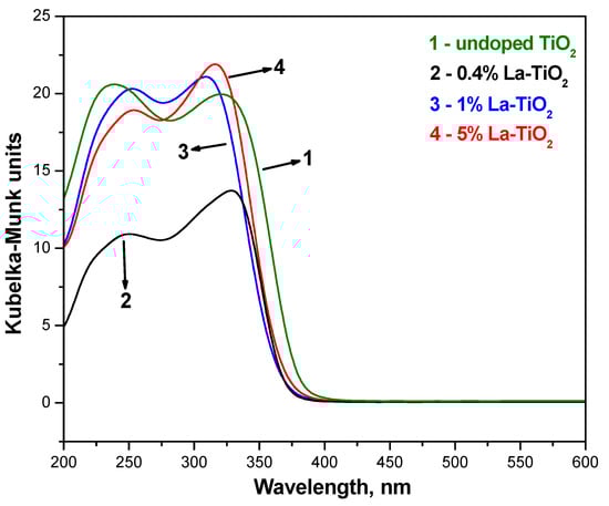 The UV–Vis diffuse reflectance spectra of La-modified samples heated at 500 °C and compared to pure TiO2 are shown in Figure 5. It can be seen that the samples exhibit strong optical absorption below 400 nm. The observed absorption edge of the as-prepared samples varies in the region of 364–369 nm (Table 2). When compared to undoped TiO2, the UV–Vis spectra of the La-doped TiO2 samples show an absorption edge shift of about 20 nm. It is obvious that the absorption edges and band gap values are very similar at the presence of different amounts of lanthanum (Table 2). Moreover, the curve shape of the spectrum of La/TiO2 samples does not nearly change. Such results have been already reported by Kočí et al. []. These demonstrate that doping with La ions did not result in the emergence of novel spectrum phenomena and may even prevent the anatase crystallite from growing []. It has to be noted that there is a very slight red shift observed only for the sample 1 La/TiO2 as compared to the pure TiO2. Evidently, these experimental results could be related to the quantum size effect as it was already suggested by Wang et al. [].