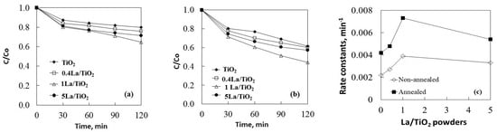 Photocatalytic efficiency of non-annealed (a), annealed (b) pure and lanthanum-doped TiO2 powders; (c) relation between rate constants and different lanthanum ion content in TiO2 powders.