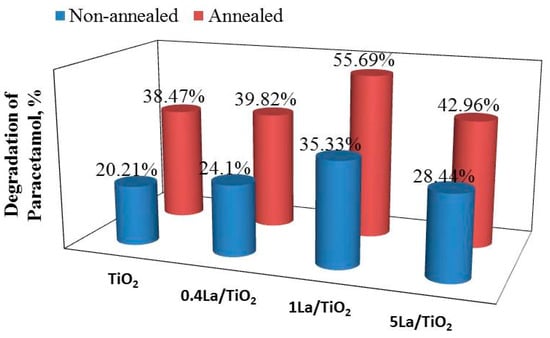 The values of the rate constants are confirmed by the degree of PCA decomposition under ultraviolet irradiation (Figure 7). The photocatalytic tests related to drug degradation showed the same trend, where the annealed powders held a higher activity than non-annealed materials. The lanthanum-doped samples degraded the analgesic faster than pure titanium dioxide. This result confirmed the positive effect of La in modified TiO2 semiconductors. The faster removal of paracetamol with La/TiO2 powders is indicated by the higher values of the k and degree of degradation, as ultraviolet light can excite e− in the catalyst, leading to more OH− groups being adsorbed onto the surface. These OH− groups on the surface can take up holes created by light irradiation, forming hydroxyl radicals that oxidize adsorbed substrates [].