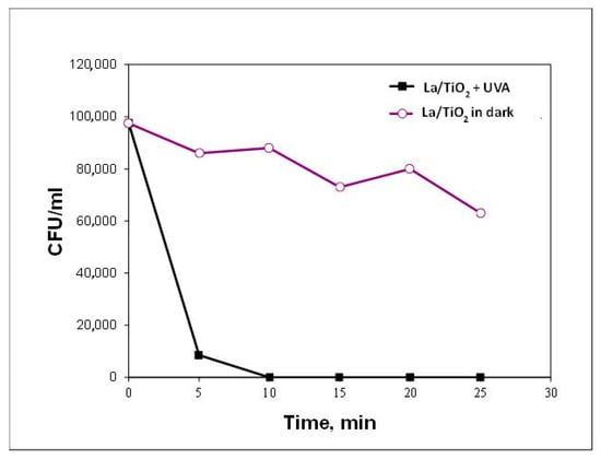 The results of the antimicrobial activity testing of the composite 1 mol% La/TiO2 are presented as kill curves in Figure 9. As is obvious, photoactivated La/TiO2 possesses a strong bactericidal effect against E. coli ATCC 25922. In the first 5 min of illumination, the number of viable bacterial cells decreased from 9.8 × 104 to 8.3 × 104 CFU/mL (91.5% reduction index), and a 100% reduction was achieved within 15 min. In dark conditions, there was not observed the removal of the cell count to the end of the experimental procedure.