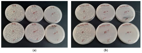 Colonies of E. coli ATCC 25922 on MHA plates in duplicate in inoculation of 100 µL of undiluted samples, 10−1, 10−2 dilutions from the following: (a) the standardized initial suspension; and (b) the suspension treated with 1 mg/mL 1 mol% La/TiO2 and UVA for 5 min.