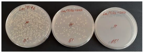 The antimicrobial activity of the prepared composite 1 mol% La/TiO2 was evaluated in the presence of ultraviolet light and in dark conditions on the basis of an experiment previously conducted by our team []. In the present study, E. coli ATCC 25922 was used as a test microorganism and the procedure was performed in two sterile flasks with a volume of 250 mL. Both flasks were inoculated with 100 mL of bacterial suspension with a viable initial cell density of about 105 colony forming units in 1 mL (CFU/mL) and 100 mg 1 mol% La/TiO2 powder. The first flask was wrapped with an aluminum foil so dark conditions were ensured. The second flask was illuminated with an ultraviolet lamp (Sylvania BLB 50 Hz 8 W T5, Newhaven, UK) with the predominant emission of 365 nm wavelength (UVA light). The lamp was located laterally at a distance of 10 cm to the reaction vessel. The experimental setup was carried out at 25 °C with continuous stirring with electromagnetic stirrers at 250 rpm. It continued up to 2 h.