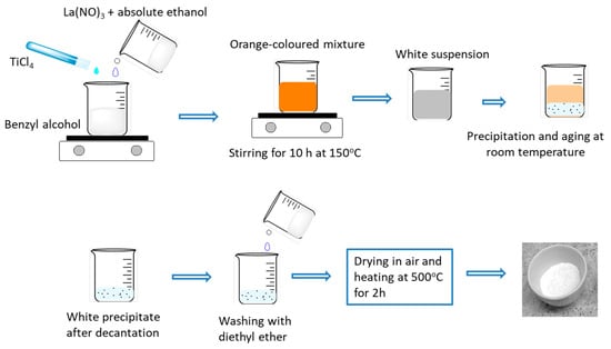 The nanopowders of La-doped TiO2 were prepared by the non-hydrolytic sol–gel procedure. The initial reagents for synthesis were titanium(IV) chloride (Fluka, Buchs, Switzerland), benzyl alcohol (Merck, Darmstadt, Germany), and lanthanum(III) nitrate (Aldrich, St. Louis, MO, USA). All the chemicals were used without further purification. The full procedure is described in our previous work and shown in Figure 12 [].