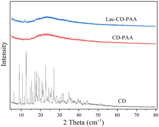X-ray diffraction curves of β-CD, CD-PAA, and Lac-CD-PAA.