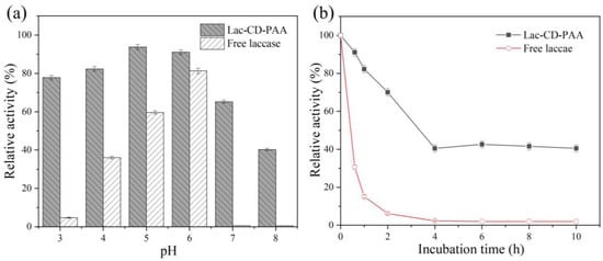 Environmental stability is one of the most important characteristics of biocatalysts for practical applications. We determined the relative residual activities of free and immobilized laccase at different pHs (3,4,5,6,7,8) and 65 °C to illustrate their stability to changes in environmental conditions. As shown in Figure 6a, the catalytic activity of free laccase was almost undetectable when the solution was under neutral or alkaline conditions, while residual activity remained in Lac-CD-PAA. As shown in Figure 6b, after 48 h of incubation, the loss of activity of Lac-CD-PAA was smaller than that of free laccase, which retained only 4.3%. Therefore, the better stability of Lac-CD-PAA compared with free laccase could be attributed to the protection of laccase by the support matrix and the buffering effect against the external environment.