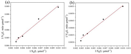 Using ABTS as the substrate, with initial concentrations ranging from 0.4 to 10.0 mM, the Michaelis-Menten kinetic parameters Km and Vmax of free and immobilized laccase were measured, and from the Lineweaver-Burk double reciprocal model of the Michaelis–Menten equation Km, Equation (3) was calculated as follows:
