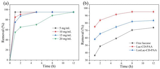 The effect of the mass concentration of methylene blue on the removal effect was investigated by placing 50 mg dry-weight Lac-CD-PAA after solubilization in different mass concentrations of the methylene blue solution (5–20 mg/L). As shown in Figure 8a, when the initial mass concentration of methylene blue was 5 mg/L, the removal effect of Lac-CD-PAA could reach 95.2% at 1 h. With the gradual increase in the mass concentration of the methylene blue solution, the time for the removal effect to reach 95.2% also increased gradually. When the mass concentration of methylene blue was 15 mg/L, it took 8 h for Lac-CD-PAA to completely remove the methylene blue, and when the mass concentration of methylene blue was 20 mg/L, it took 12 h for Lac-CD-PAA to completely remove the methylene blue. Considering the economic benefits of the actual application and the change in the activity of laccase, the mass concentration of methylene blue was set at 15 mg/L for the present experiment.