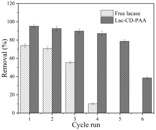 The reusability of biocatalysts is an extremely important evaluation indicator of whether they can be popularized in practical applications. As shown in Figure 9, to evaluate the performance of immobilized laccase, free laccase and Lac-CD-PAA were placed in methylene blue solution and incubated repeatedly six times to determine their removal rates from methylene blue. After six repetitions, the removal of methylene blue by Lac-CD-PAA was significantly better than that of free laccase, which indicated that the recovery rate of Lac-CD-PAA was greatly improved, although the adsorption sites on the material were gradually saturated with the continuous adsorption of methylene blue, and laccase could oxidize and decompose methylene blue to restore the adsorption sites, allowing methylene blue to be removed continuously and effectively [].