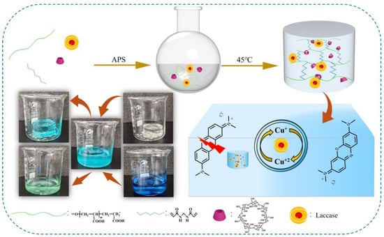 The optimal preparation process of hydrogel-entrapped laccase was as follows: 1 g of β-cyclodextrin (β-CD) powder was dissolved in 20 mL of water, heated at 50 °C, stirred for 10 min until all of it was dissolved, and 50 g/L of β-CD solution was prepared. A 70% AA solution was prepared by taking 50 mL of pure acrylic acid (AA) monomer and mixing it with 30 mL of NaOH solution (20 wt%). In total, 7.2 g of 70% AA solution was added to a single neck flask along with 20 mL of β-CD solution and stirred to mix well. Then, 0.1 g of MBA crosslinker was added to the flask and mixed well, and stirring was continued until all the mixture was dissolved and cooled to room temperature. To the flask, we continued to add 0.1 g/mL of the initiator ammonium persulfate (APS) at 5 mL and mixed well at 150 rpm and room temperature. The above mixed homogeneous solution was poured into a mold and placed in an oven at 40 °C for 2 h until it completely became a hydrogel. The prepared hydrogels were washed three times with deionized water to remove unreacted raw material components and small molecular compounds. The washed hydrogels were dried with a freeze dryer (BUCHI Labortechnik AG, Model: BUCHI-L200) for 48 h. The prepared hydrogel-entrapped laccase composite (denoted as Lac-CD-PAA) was cut into blocks (2 mm × 2 mm) and stored in a −20 °C refrigerator for use in the following experiments. A portion of Lac-CD-PAA was soaked in methanol overnight to inactivate laccase, and the inactivated Lac-CD-PAA was recorded as LoseLac-CD-PAA.