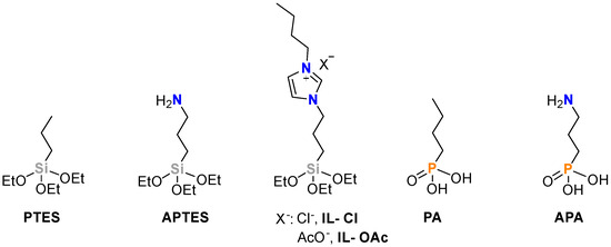 The modified catalysts were prepared according to two distinct approaches using triethoxysilanes (TESs) and organophosphonic acids (PAs) as modifiers (Figure 1).