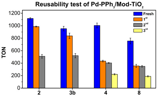 The presence of the PPh3 ligand during the synthesis of the Pd NPs over supports modified with APTES and IL-OAc was evaluated (Table 2). In both cases, slightly higher TON values were obtained in the absence of PPh3 (Entry 4 vs. Entry 5 and Entry 8 vs. Entry 9). When 3a was used, a TON of 868 was obtained (Entry 4), while in the system without PPh3, 3b provided a TON of 917 (Entry 5). IL-OAc, 6a, which was synthesized in the presence of PPh3, reached a TON of 776 (Entry 8), while its analogue without PPh3, 6b, yielded a TON of 826 (Entry 9).