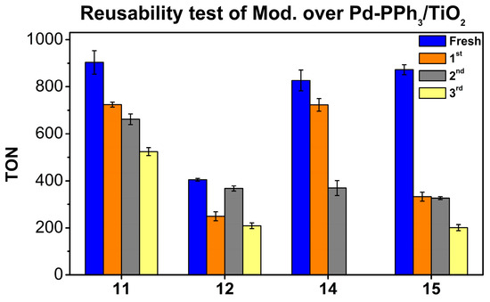 In Table 2, the results obtained with systems 1–8 are displayed and compared with those provided by the unmodified Pd-PPh3/TiO2 catalyst (TON of 881, Entry 1) under the same conditions [80]. When 2 was used as catalyst, a TON of 1057 was reached (Entry 3), whereas using material 8, modified by organophosphonic acid (Entry 11), a decrease in activity was observed, and the lowest TON value of the series was measured (694). These results therefore indicated that when the catalyst is formed by deposition of the Pd NPs over the modified support, the nature of the modifier affects the catalyst activity.