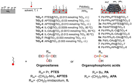 In the first approach, the TiO2 support was modified prior to Pd NP deposition, whereas in the second approach, the Pd NPs were initially supported onto TiO2 [80], and the modifiers were reacted subsequently (Scheme 2).