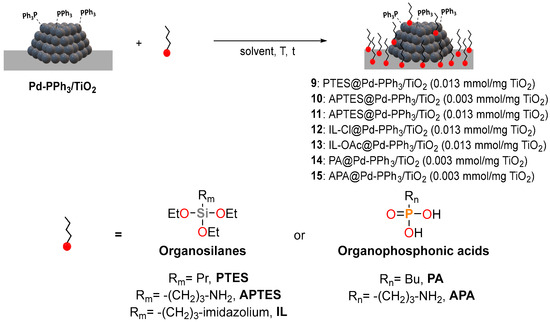 A new series of catalysts was synthetized by deposition of TESs and PAs modifiers over the previously synthesized Pd-PPh3/TiO2 material (Scheme 4). The newly prepared systems were characterized by TEM and ICP, and FT-IR, TGA, HR-TEM, and XPS analyses were also performed for representative examples.