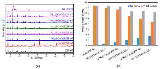 (a) Diffraction patterns of Nix@CoO@ZIF-67, ZIF-67, CoO@ZIF-67, and Ni-Hmim. (b) The metal content measured by ICP-OES in Nix@CoO@ZIF-67.