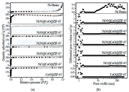 The decreased surface area at high Ni ratios (30–50% Ni ratio) was correlated with the reduced pore volume and pore size (Table 1). The DFT pore size distribution further confirmed the presence of micropores in Nix@CoO@ZIF-67 (pore size < 2 nm), as shown in Figure 2b. In contrast, the pore size distribution of Ni-Hmim indicated that the material predominantly contained large pores (>10 nm) with a slight mixture of micropores.