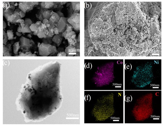 SEM Images of CoO@ZIF-67 (a) and Ni10@CoO@ZIF-67 (b), TEM images (c), and elemental mapping of Ni10@CoO@ZIF-67 on cobalt (d), nickel (e), nitrogen (f), and carbon (g).