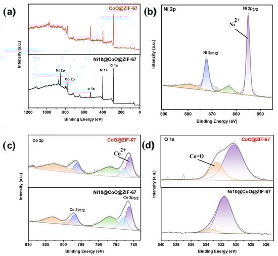 Nickel incorporation was confirmed by the binding energies of the Ni 2p spectra (Figure 4d). The Ni10@CoO@ZIF-67 showed characteristic peaks of Ni 2p3/2 at 854.8 eV and Ni 2p1/2 at 872.1 eV, indicating the presence of Ni2⁺ [37,40]. It is important to note that the nickel source used in the synthetic precursor was Ni2⁺, validating that the state of Ni was maintained during the SST method.