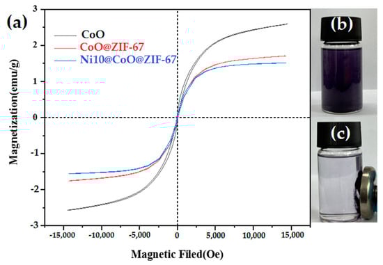 (a) VSM curves of CoO, Coo@ZIF-67, and Ni10@CoO@ZIF-67. (b) Images of catalyst dispersion, and (c) the external magnet to separate the Ni10@CoO@ZIF-67 from the reaction mixture.