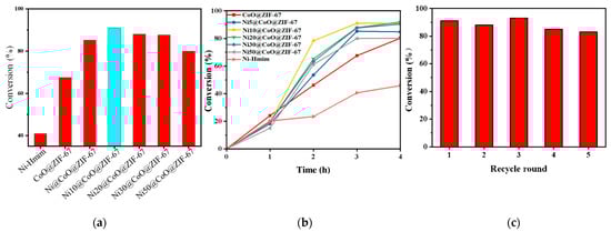 The synthesized materials were applied as heterogeneous catalysts for the ring-opening polymerization (ROP) of L-lactide (LA). Under similar reaction conditions, the incorporated Ni catalyst demonstrated an improvement in catalytic performance compared to the non-nickel functionalized catalyst (CoO@ZIF-67), as shown in Figure 6a. Specifically, Ni10@CoO@ZIF-67 exhibited the highest catalytic conversion of LA at 90%, which is approximately 20% higher than that of CoO@ZIF-67. However, further increasing the Ni content in the catalysts (Ni20@CoO@ZIF-67, Ni30@CoO@ZIF-67) did not result in a significant change in catalytic performance, and a decrease in conversion was observed with the highest Ni content catalyst (Ni50@CoO@ZIF-67). Meanwhile, the Ni-Hmim catalyst, which replaced cobalt with nickel in the synthetic precursor, resulted in the lowest conversion of LA (40%) under similar reaction conditions.