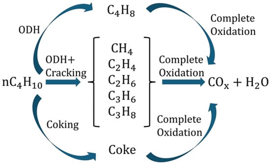 The ODH process offers, instead, a more efficient alternative to produce C3 and C4-olefins with high selectivity. The overall ODH reaction is exothermic and can therefore, be conducted at lower temperatures. In addition, coke formation is limited. Consequently, the life of the catalyst can be extended significantly [11,12]. However, achieving high olefin selectivity is challenging, given the non-negligible amounts of complete oxidation products such as carbon dioxide. Thus, ODH requires efficient catalysts that limit complete n-butane oxidation [13,14]. These catalysts should supply solid-phase oxygen without having oxygen in the gas phase (gas-phase oxygen-free conditions), boosting, in this manner, olefin selectivity. In this way, metal oxide-based catalysts can function both as catalysts and as solid-phase oxygen providers, with their lattice oxygen favoring ODH olefin selectivity [15,16].