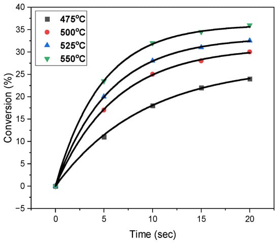 Figure 2. N-Butane conversion values at various reaction times and temperatures. The reported data are average values for four consecutive injections. Note: the typical standard deviation for repeat runs was ±7.16–9.56%.
