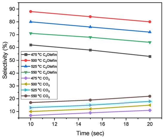 Figure 3 reports that longer reaction times lead to a decrease in C4-olefin selectivity while simultaneously increasing COx production. Thus, on this basis, shorter contact times (e.g., 10 s), which favorably facilitate ODH in downer or riser units, are preferred. Furthermore, in Figure 3, one can observe that 500 °C provides an optimum selectivity, reaching 90% butene selectivity, at 10 s. This behaviour can be assigned to the difference in magnitude between pre-exponential factors and energies of activation for ODH and COx formation. As a result, one can conclude that the kinetic constant values reflect the significant influence of temperature and contact time on reaction selectivity, favoring butene formation at specific optimal conditions.