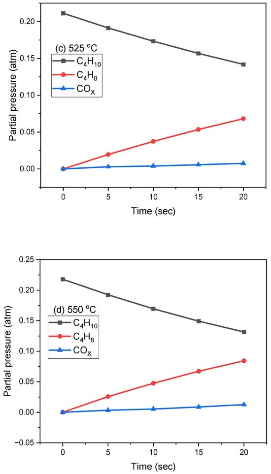 Figure 2 reports that both temperature and reaction time have positive effects on n-butane conversion, which rises from 9% at 475 °C in 5 s to 37% at 550 °C and 20 s. Thus, longer contact times and higher temperatures are desirable properties for promising ODH, given that these conditions lead to more effective lattice oxygen utilization.