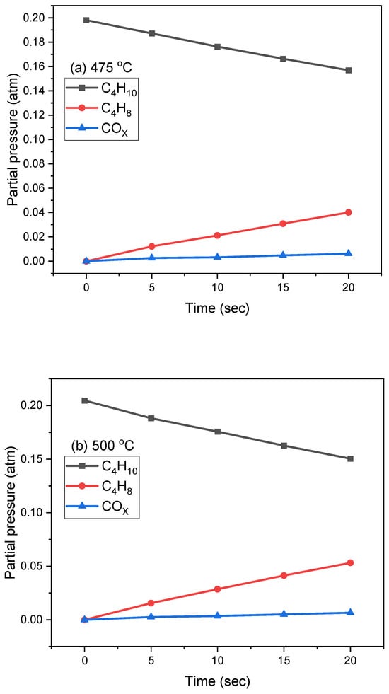 Figure 2 reports that both temperature and reaction time have positive effects on n-butane conversion, which rises from 9% at 475 °C in 5 s to 37% at 550 °C and 20 s. Thus, longer contact times and higher temperatures are desirable properties for promising ODH, given that these conditions lead to more effective lattice oxygen utilization.