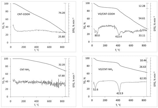 Thermal TG (solid line) and DTG (dotted line) profiles for CNTs and VO/CNTs catalysts.